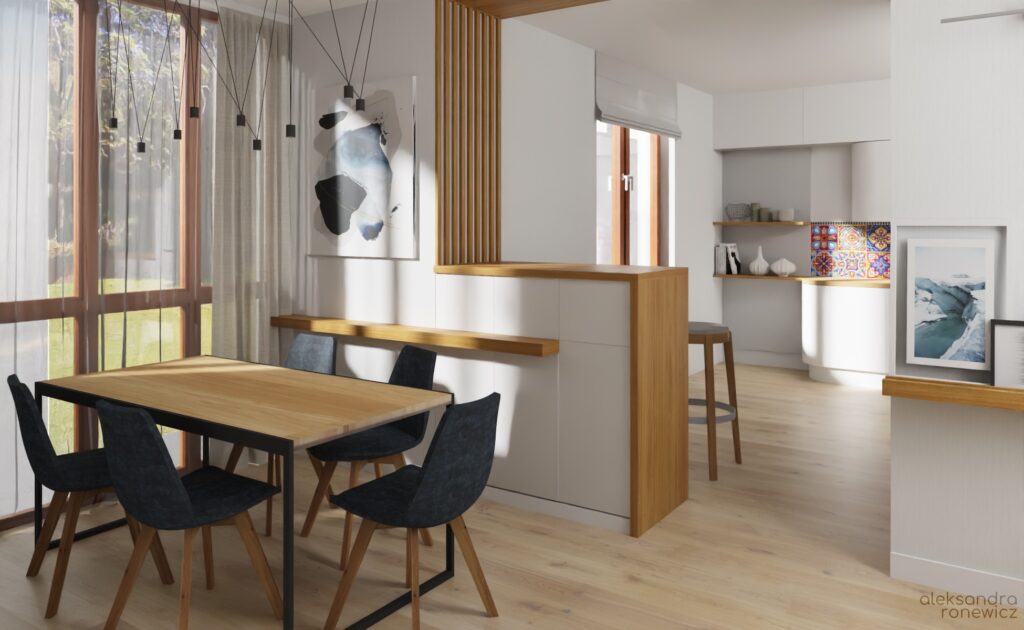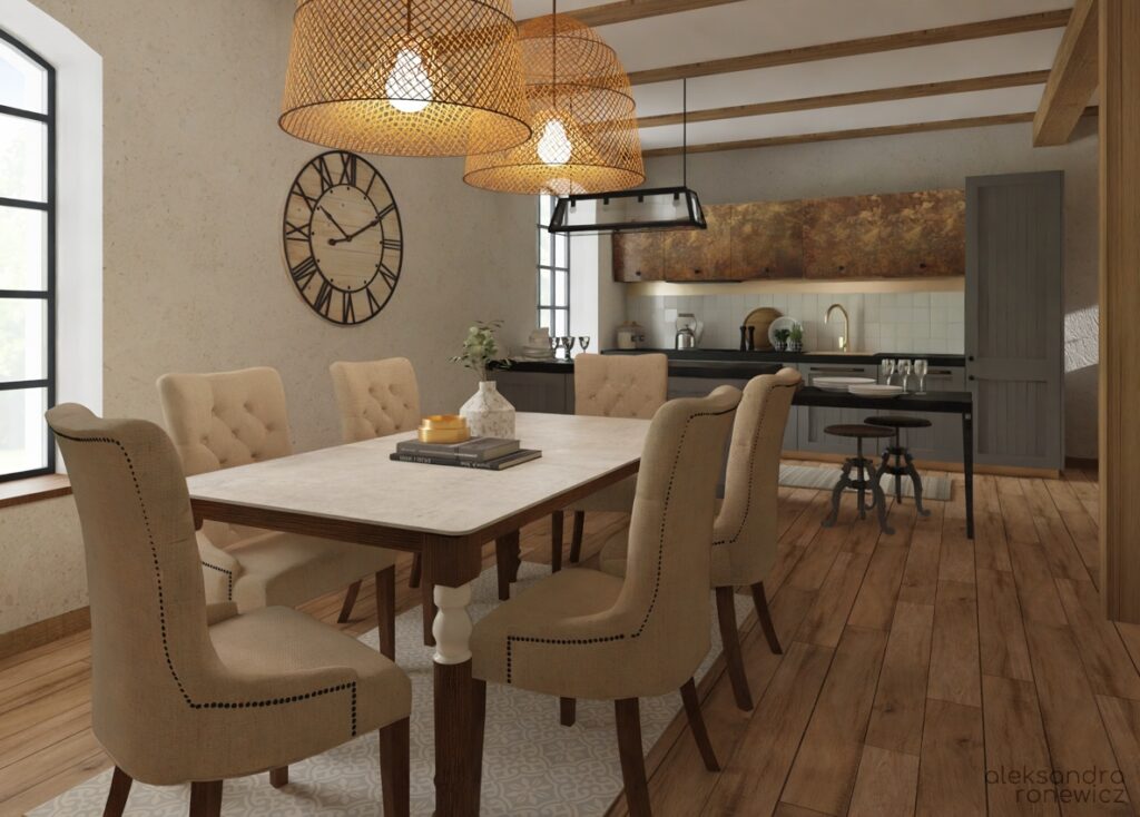 Projekt aranżacji wnętrz dawnego młyna w Sławoborzu / koncepcja z adaptacją na cele mieszkalne / widok na aneks kuchenny