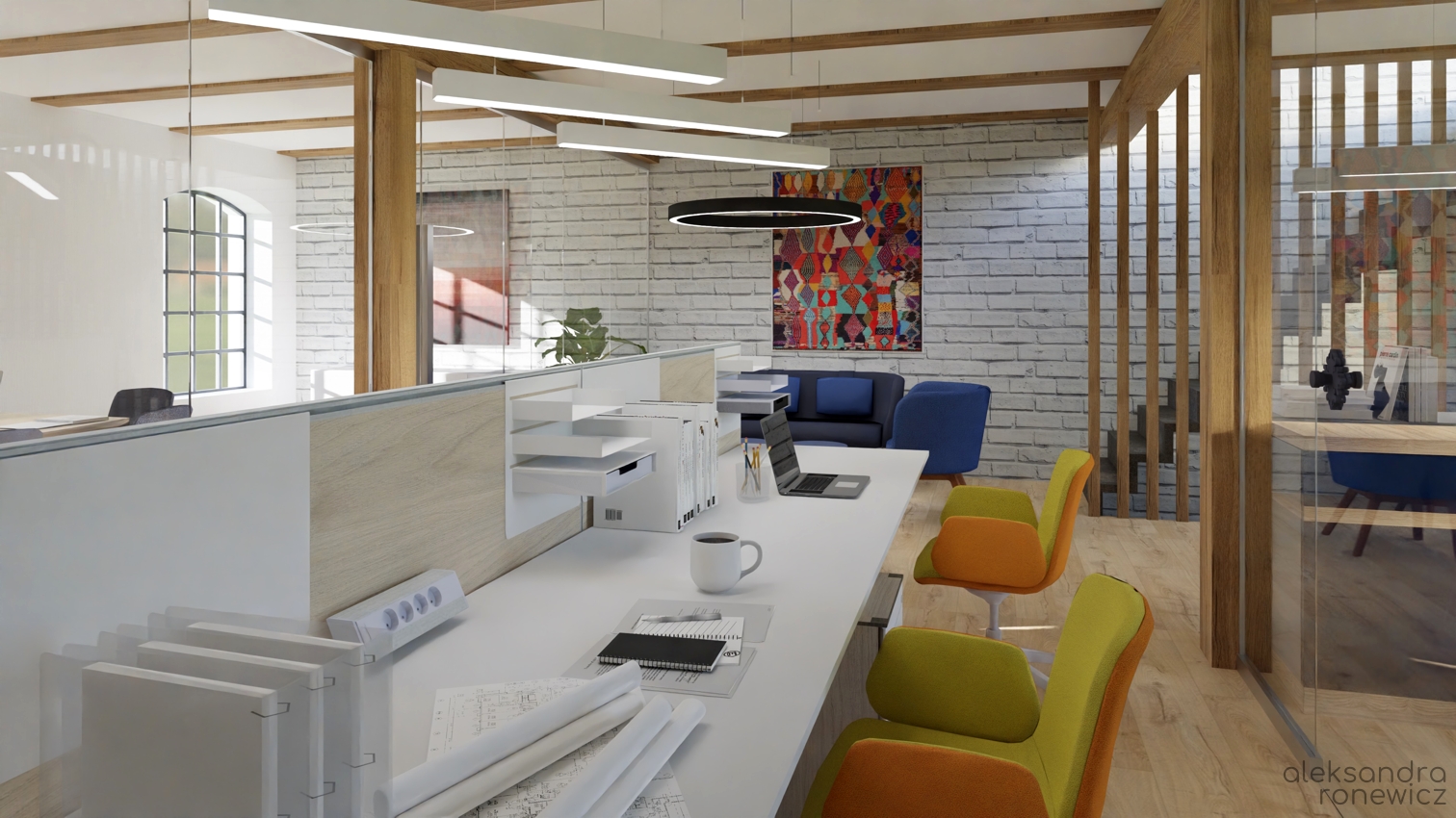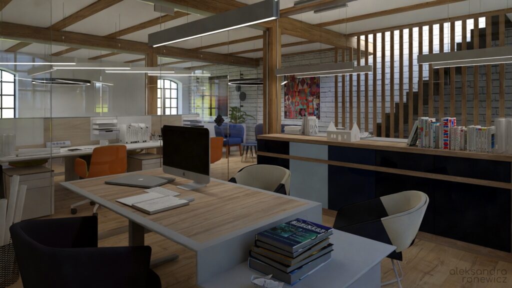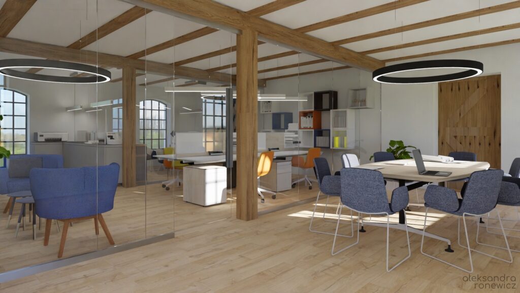 Projekt aranżacji wnętrz dawnego młyna w Sławoborzu / koncepcja z adaptacją na cele biurowe
